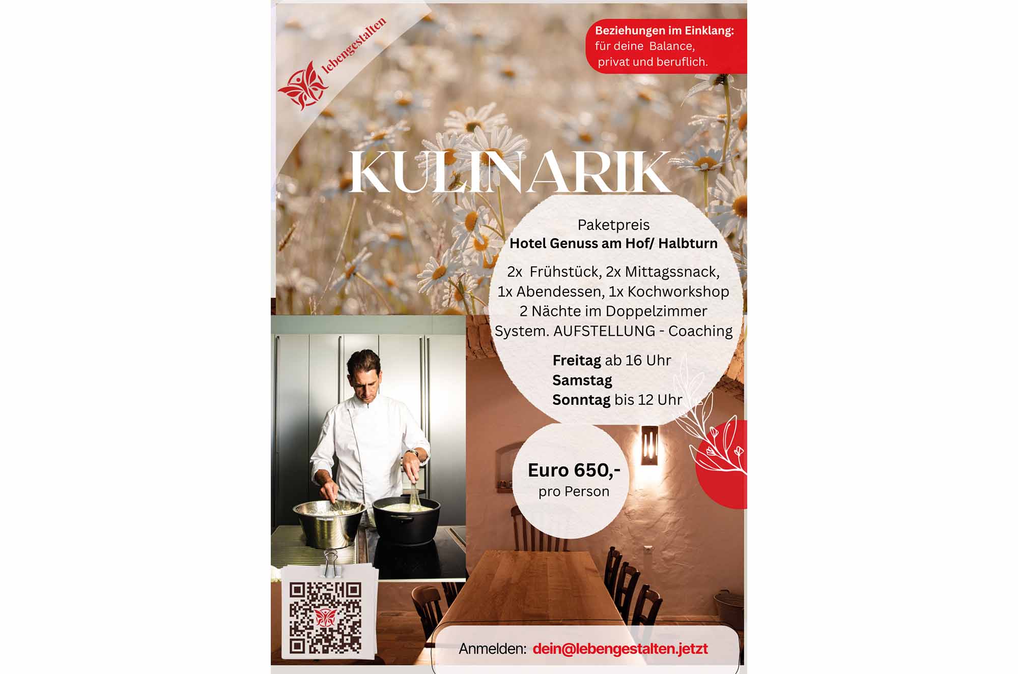 Vom Blick hinter Prägung und Beziehungsmuster über eine Auszeit in der Natur und einem Kochworkshop sowie einem Genussprogramm.