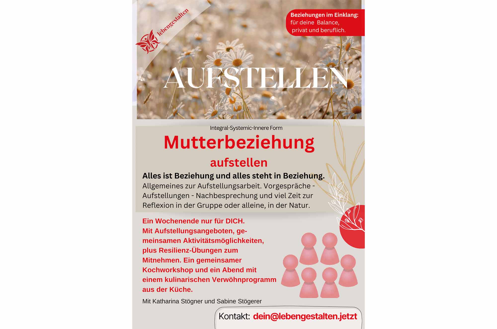 Sabine Stögerer und ich (Katharina Stögner) begleiten dich mit Erfahrung, Klarheit und Präsenz. Es ist uns eine Freude, dieses Wochenende gemeinsam zu gestalten und einen sicheren Raum für Entwicklung zu öffnen.
