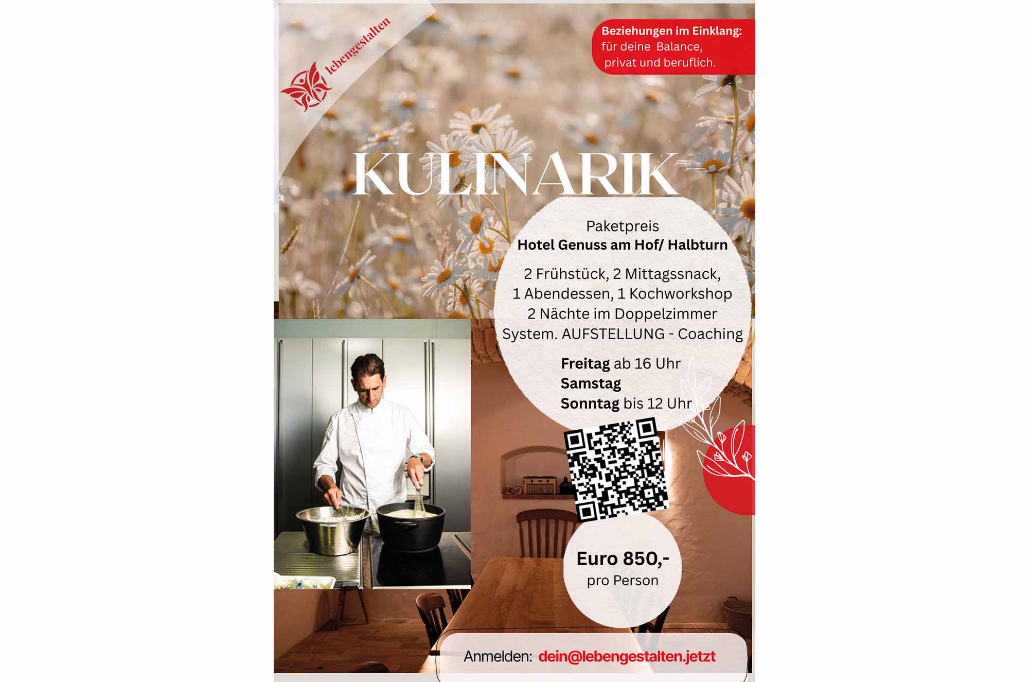 Vom Blick hinter Prägung und Beziehungsmuster über eine Auszeit in der Natur und einem Kochworkshop sowie einem Genussprogramm.